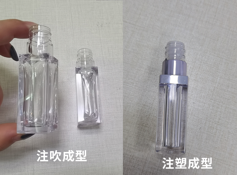 液體口紅一般又叫唇彩、唇釉、唇泥,不同于固體口紅的是液體口紅會更加水潤,也會更持久,因此深受大家的喜愛,也逐漸成為市場熱銷品。承載液體口紅的口紅管大都是塑膠材料,塑膠材料通過注塑或者注吹兩種方式加工成型,兩者的區(qū)別主要在于,注塑是由兩個或以上的配件組裝而成,而注吹是一體成型的,不需要后續(xù)的組裝就能成為一個完整的瓶子,如下圖。今天誠邦化妝品包材注塑廠家就迎來了一個做彩妝的客戶,他們的設計理念是用注吹機一體成型,因此過來實地考察液體口紅管包材注吹定制過程。
