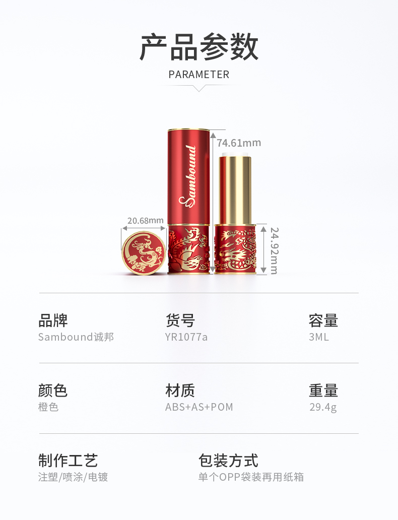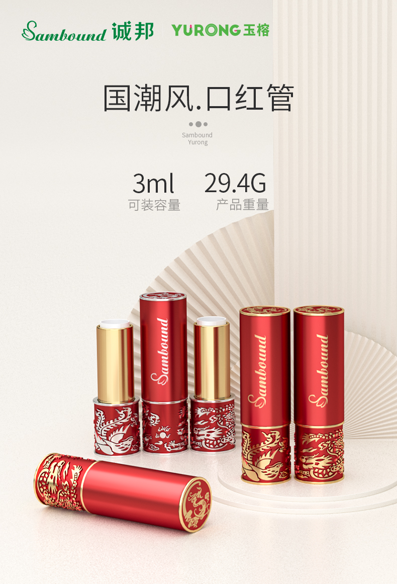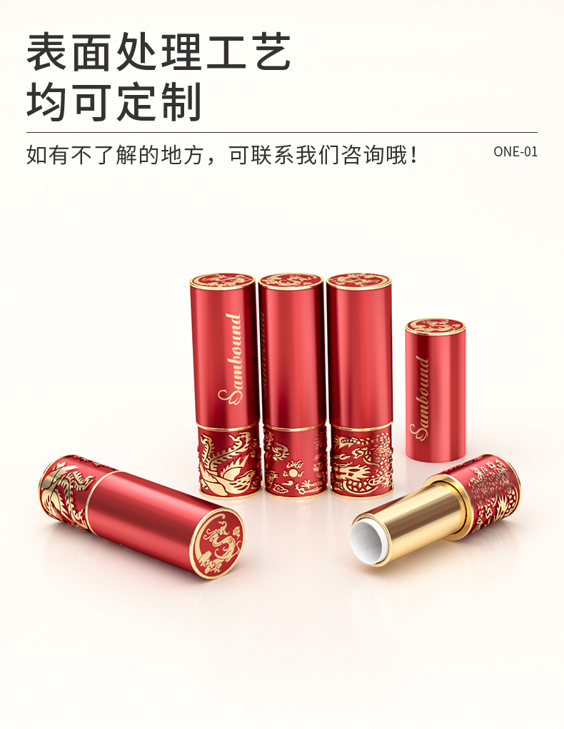廠家定制圓形國潮風(fēng)口紅空管龍鳳口紅管包材,化妝品包材加工定制,我們可以做各種各樣的裝飾,從金屬化,hs,噴涂,uv涂層,電鍍等,也可以注射任何顏色