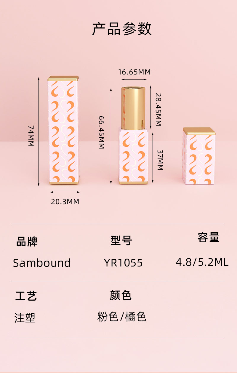 產(chǎn)品名稱口紅管包材產(chǎn)品貨號YR1055容量5ML顏色粉色-可定制材質(zhì)ABS+鋁重量32 9g制做工藝注塑 噴油 真空電鍍包裝方式單個OPP袋裝再用紙箱