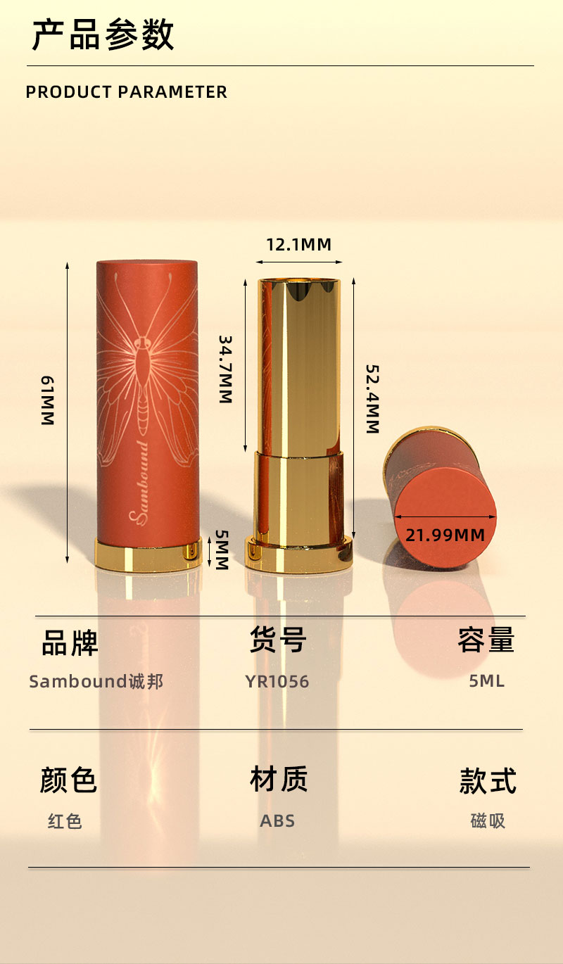 產(chǎn)品名稱口紅管包材產(chǎn)品貨號YR1056容量5ML顏色紅色-可定制材質(zhì)ABS+鋁重量32 9g制做工藝注塑 燙金 真空電鍍包裝方式單個(gè)OPP袋裝再用紙箱