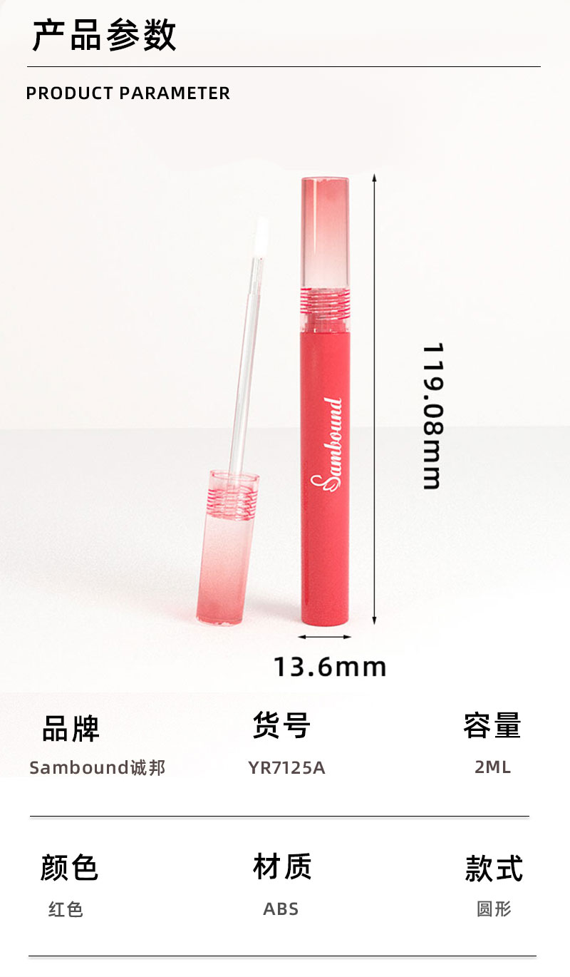 產品名稱唇彩包材產品貨號YR7125容量2ML顏色紅色-可定制材質ABS重量32 9g制做工藝注塑包裝方式單個OPP袋裝再用紙箱