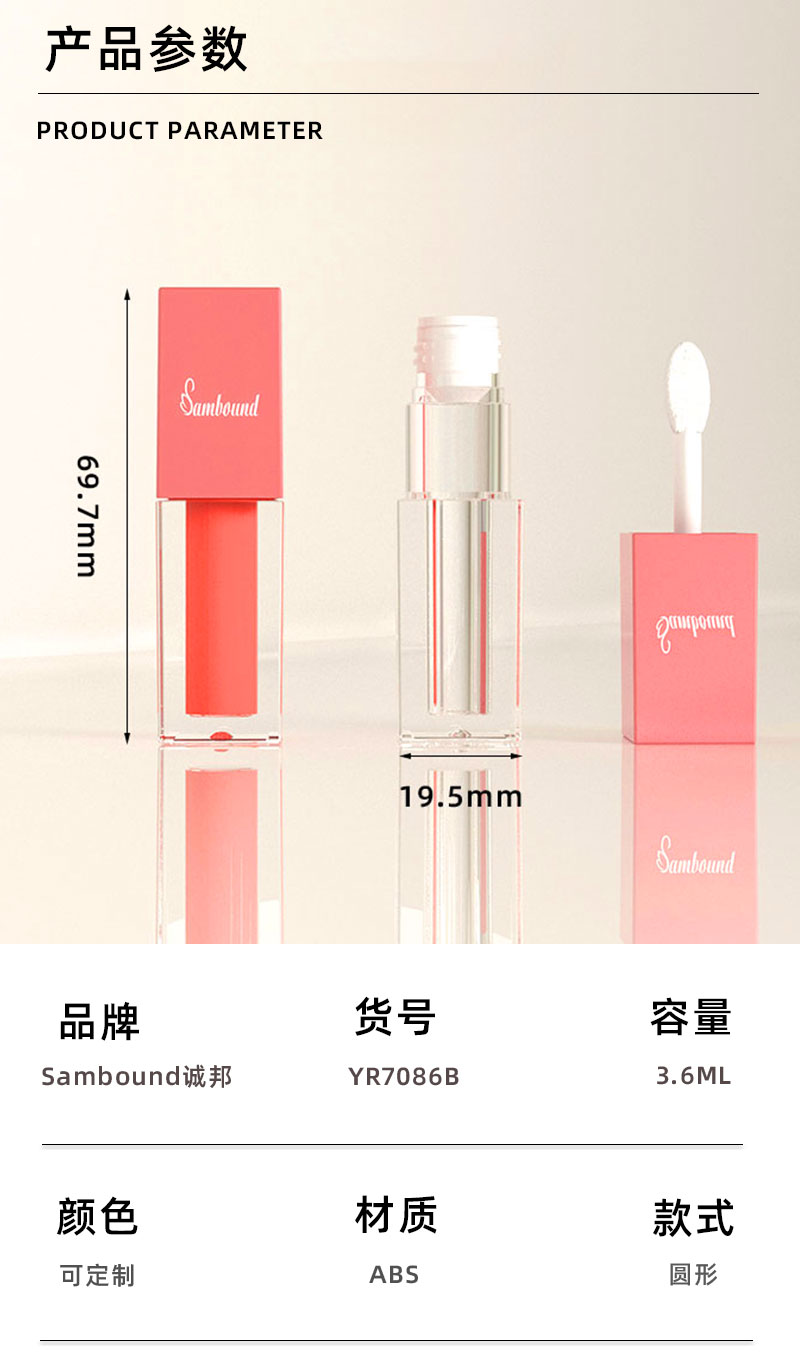 產(chǎn)品名稱唇釉包材產(chǎn)品貨號(hào)YR7086容量3 6ML顏色粉色-可定制材質(zhì)ABS重量32 9g制做工藝注塑 真空電鍍包裝方式單個(gè)OPP袋裝再用紙箱