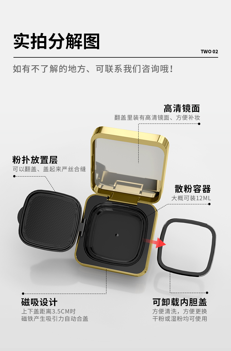 東莞廠家加工定制高端氣墊盒空BB霜盒帶可替換裝,金色電鍍注塑加工廠家為您加工定制化妝品包材,可以定制按照您的需求定制logo、顏色以及表面處理工藝。