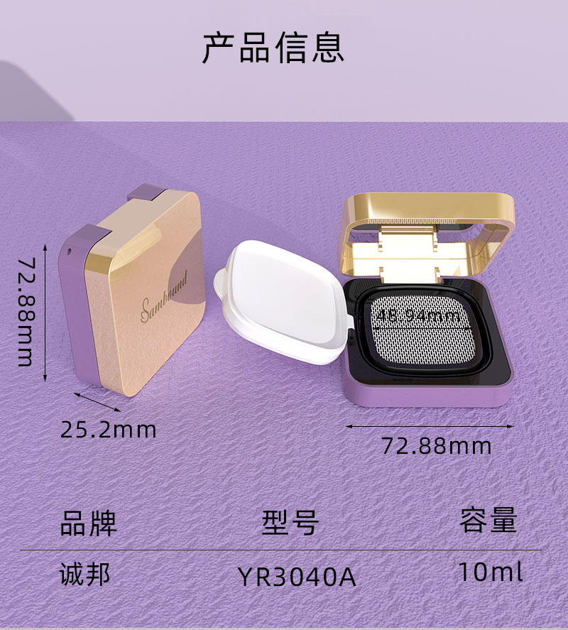 產(chǎn)品名稱氣墊包材產(chǎn)品貨號(hào)YR3040容量17ML顏色金色-可定制材質(zhì)ABS重量32 9g制做工藝注塑 噴油 真空電鍍包裝方式單個(gè)OPP袋裝再用紙箱