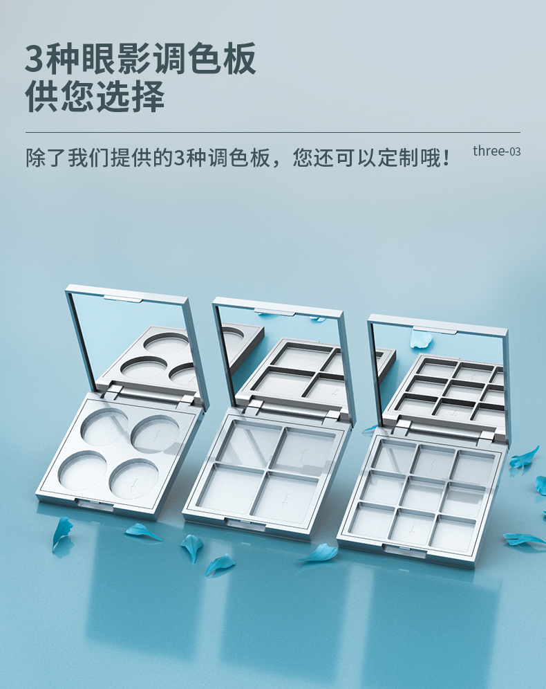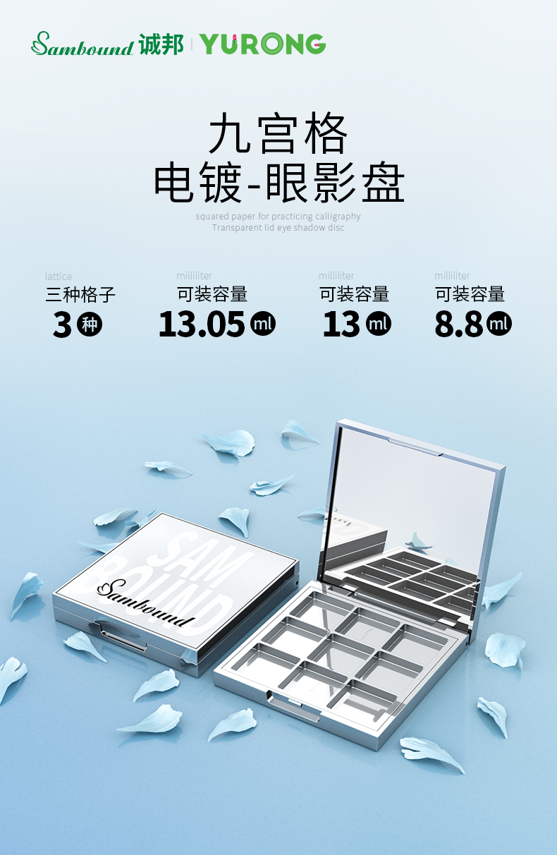東莞誠邦化妝品包材廠家定制的這款9宮格眼影盤采用銀色電鍍工藝,奢華有質(zhì)感,并且使用按扣開關(guān)設(shè)計,方便操作??梢远ㄖ莆淖謑ogo