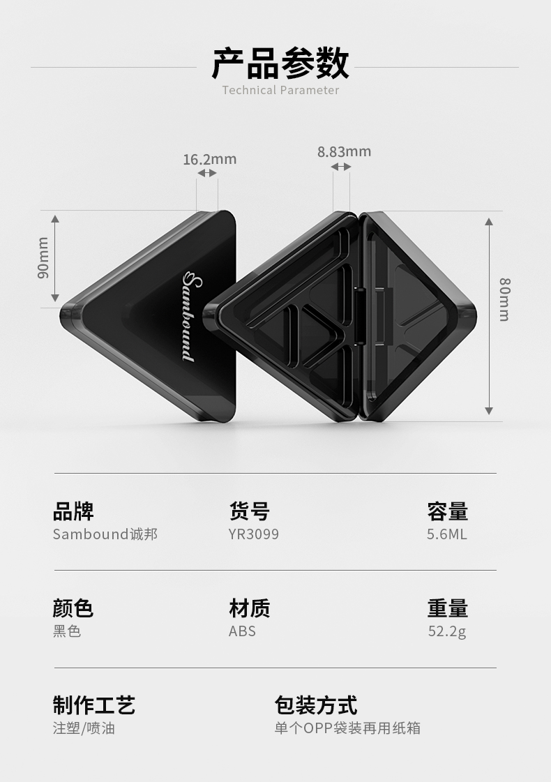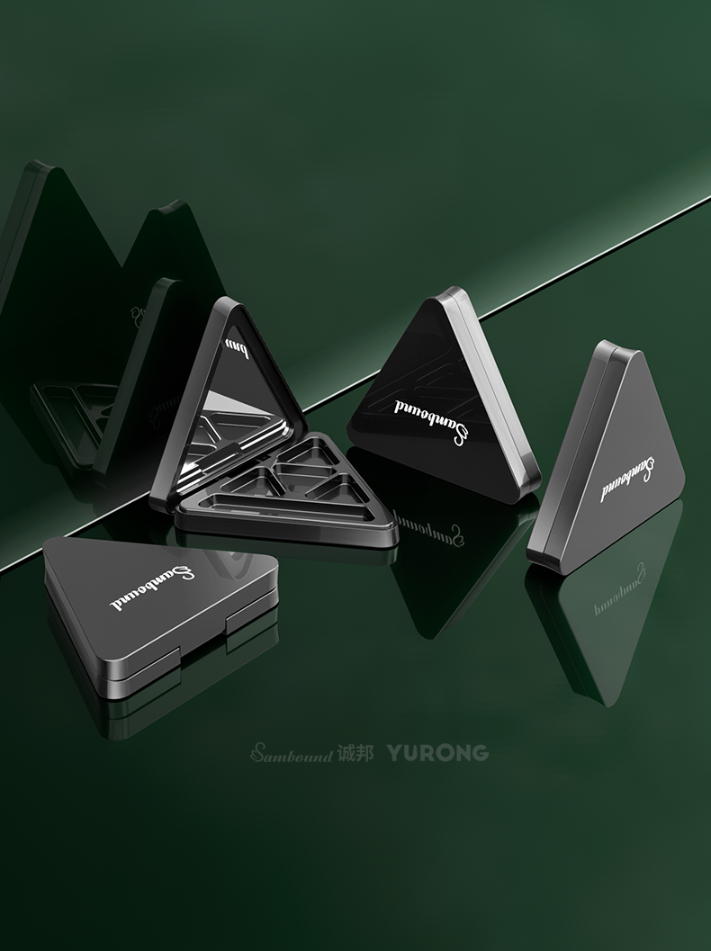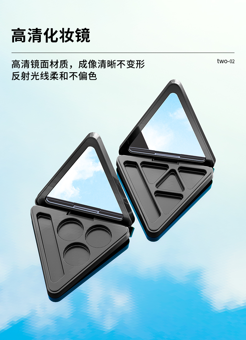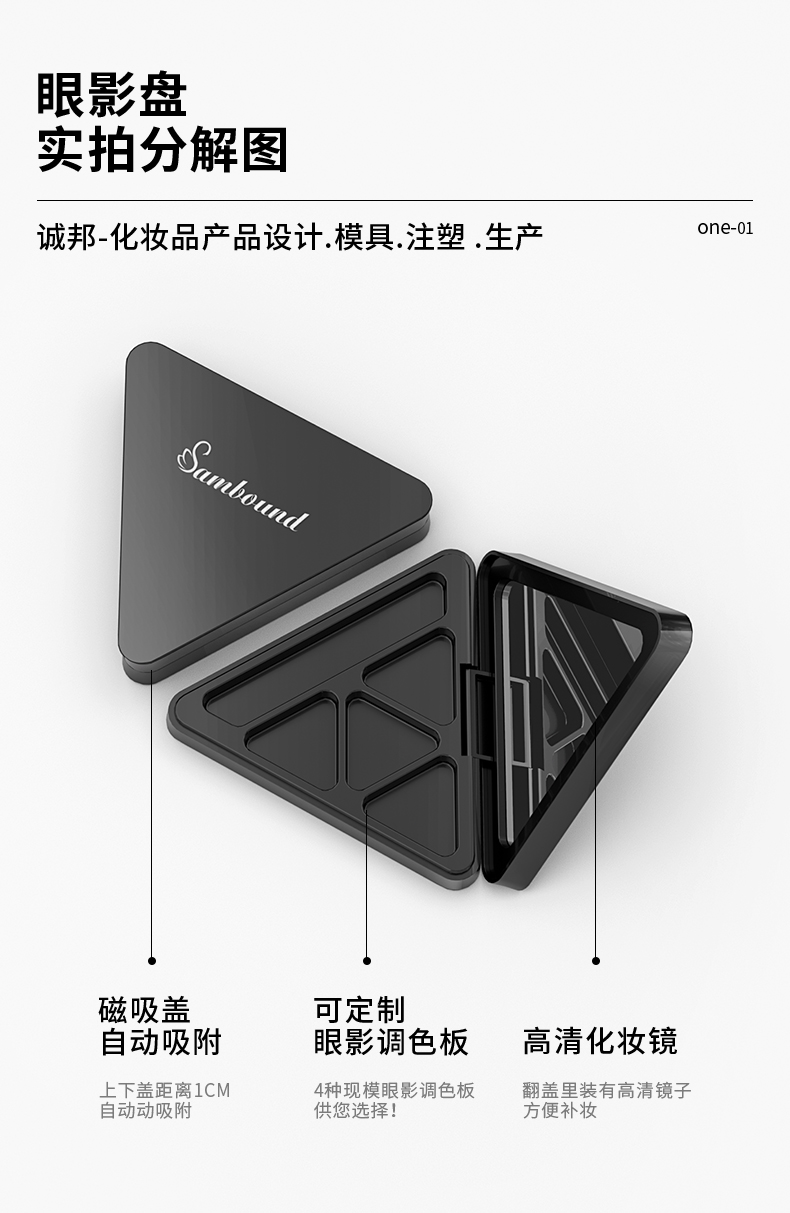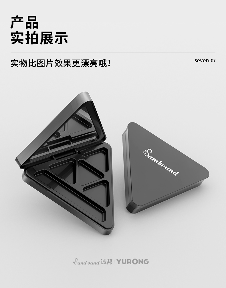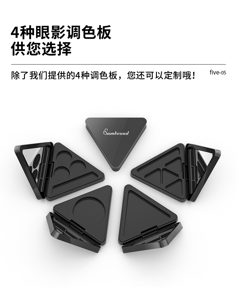 這款空磁吸三角形眼影盤(pán)彩妝包材可定制logo、顏色,有4種內(nèi)格可選,內(nèi)帶高清化妝鏡,磁吸開(kāi)關(guān)更方便,公模加工定制廠(chǎng)家