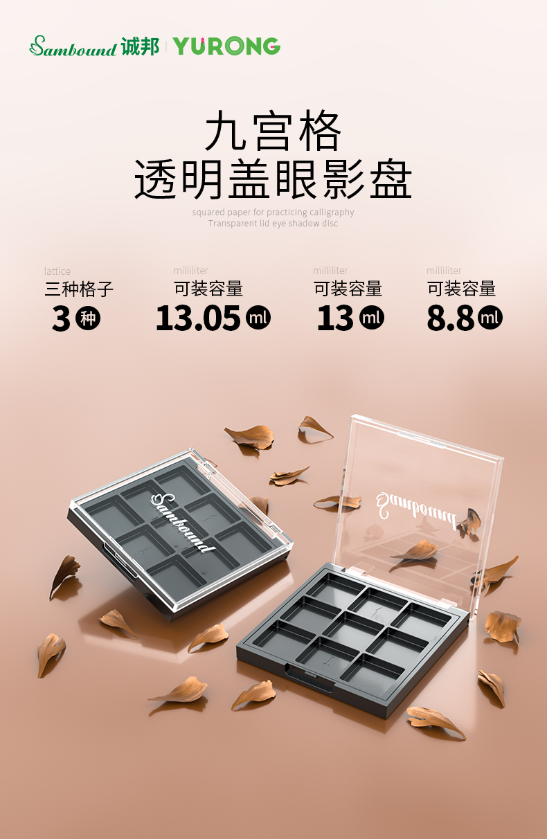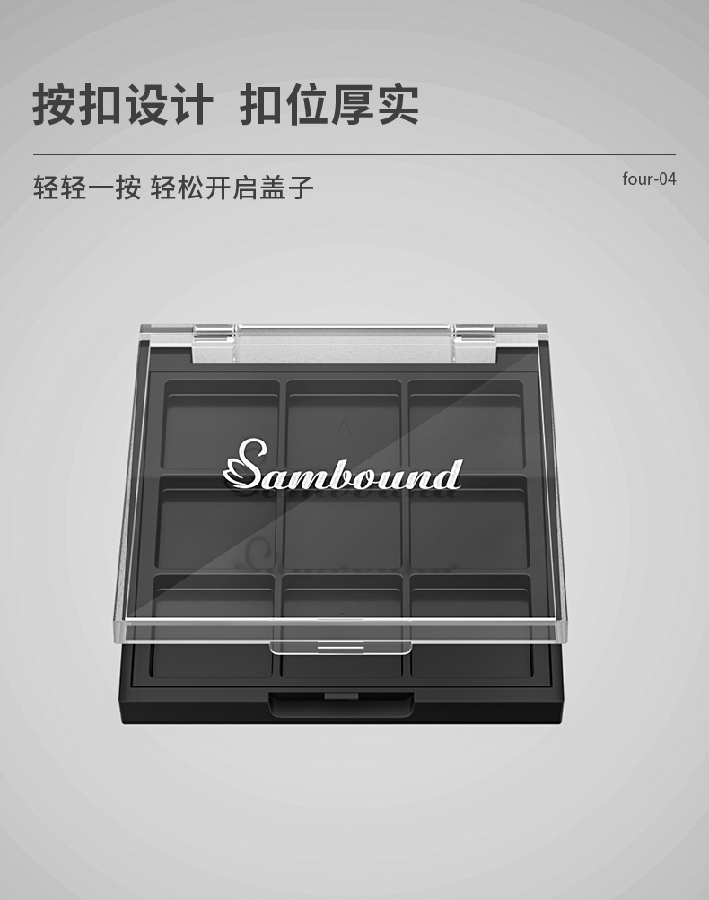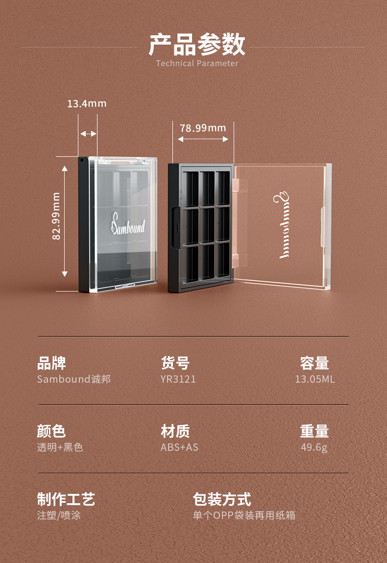 化妝品包裝供應(yīng)商定制方形透明9色眼影盤包材,該產(chǎn)品特點(diǎn):透明蓋子、可定制logo、顏色及表面處理,采用按扣開關(guān),公模定制加工生產(chǎn)。