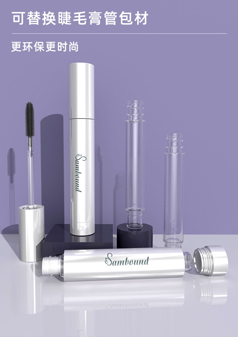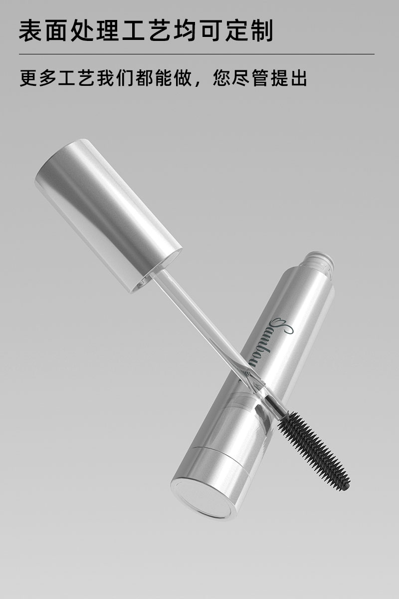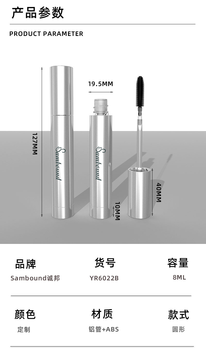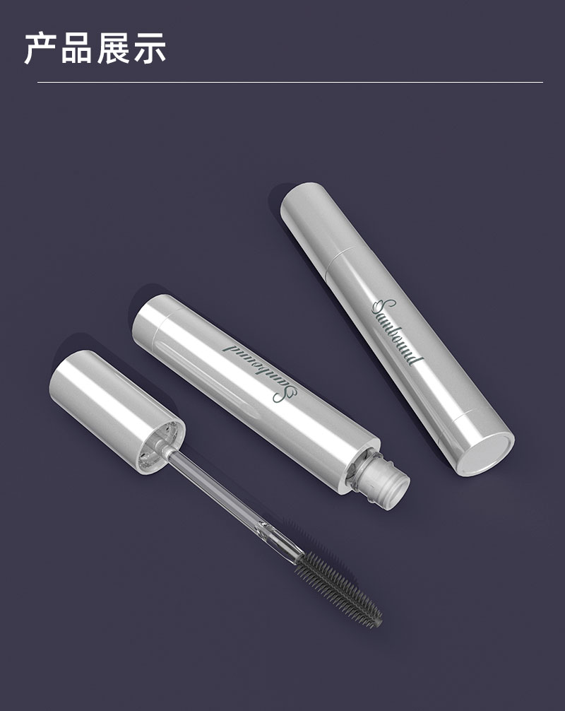 產(chǎn)品名稱睫毛膏管包材產(chǎn)品貨號YR6022B容量8ML顏色銀色-可定制材質(zhì)ABS+鋁重量32 9g制做工藝注塑 噴油 真空電鍍包裝方式單個OPP袋裝再用紙箱